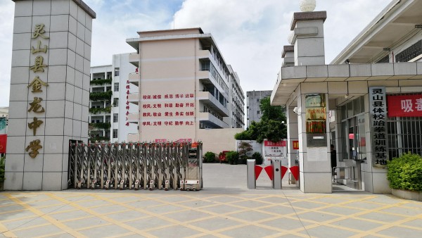 广西灵山县金龙中学,1997年2月从金龙小学分离出来,独自成立了今天了金龙中学。建校初,有教职工十多人,在校学生300多人,有六个教学班,其中初一级两个班,初二级两个班,初三级两个班。当时校园面积不足五亩,建有一栋教室,一个厕所。虽然当时师资力量薄弱,家长的教育意识落后,在首任校长左健的领导下,金龙中学每年都有不同的变化,在教学方面有了进步和资源方面得到改善,环境也有所改善。每年的教学成绩显著。