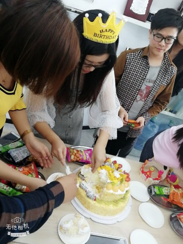 在生日会上,全体员工欢聚在一起,一同唱起《生日快乐》的祝福歌、共同吹灭生日蜡烛、同享生日蛋糕,欢歌笑语充满了整个生日会场。
