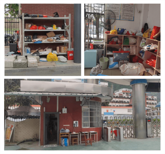 校门口快递/物品随意堆放,无专人管理,影响整体校园形象